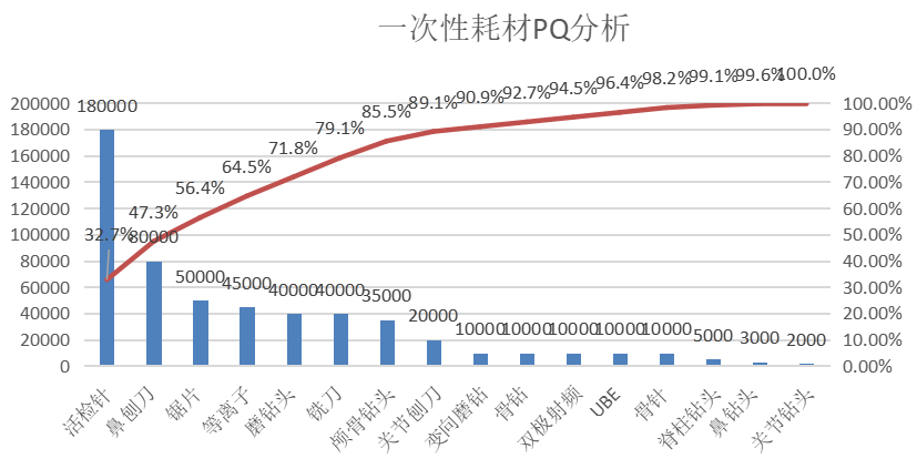 根據工廠的產品的產品族分析,工廠活檢針類產品的銷量占產品的32.7%,為一次性耗材第一,活檢針,鼻刨刀,鋸片,等離子,磨鉆頭,銑刀,顱骨鉆頭量占比總量的85.5%。