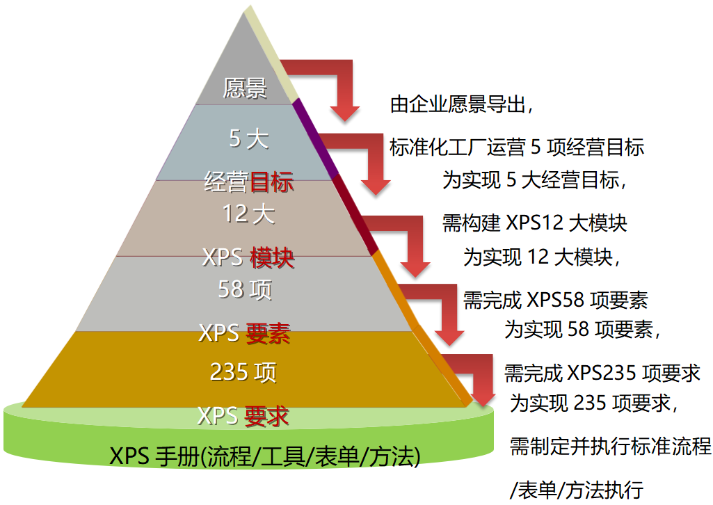 XPS系統架構分由理念、原則、模型、目標、要素、要求部分構成,其理念為:“XPS-A持續變革系統”是以A集團及下屬企業戰略為導向,結合企業運營的具體情況,運用世界上最行之有效的績效改善工具和方法,幫助企業建立和完善高效的運營系統和模式-XPS持續變革系統,使企業在產品創新、流程創新、人才培養、利潤創新等方面的績效達到世界領先水平,并形成與企業自身文化相融合的持續改善文化,構筑企業的核心競爭力。“