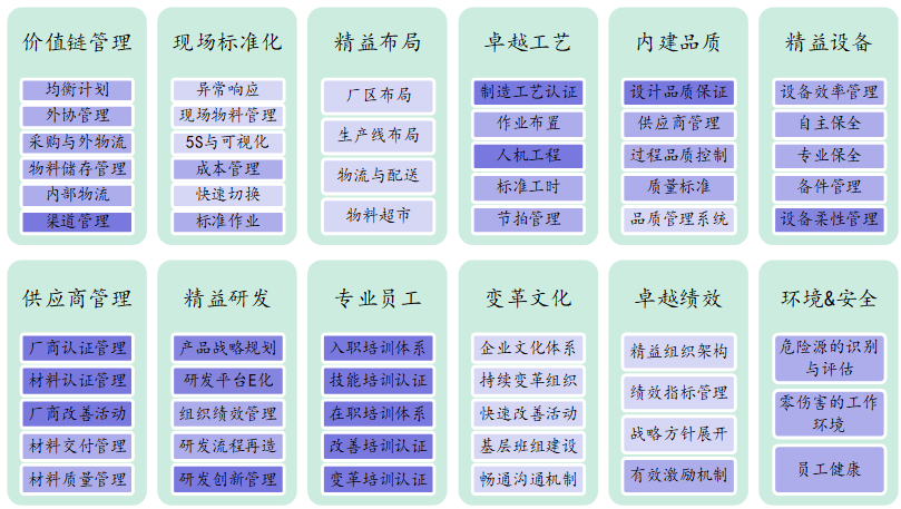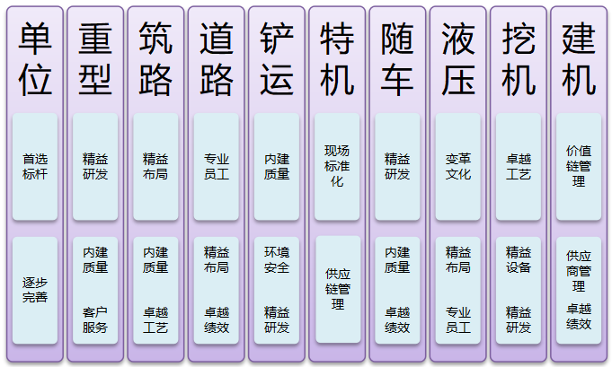 XPS根據A集團及所處行業的特點,建構其獨具特色的模型,以A集團十二五戰略目標為愿景,制定了世界級企業關注的5大目標,工程機械行業運營中最重要的12大模塊,提煉出58項要素和235項要求。